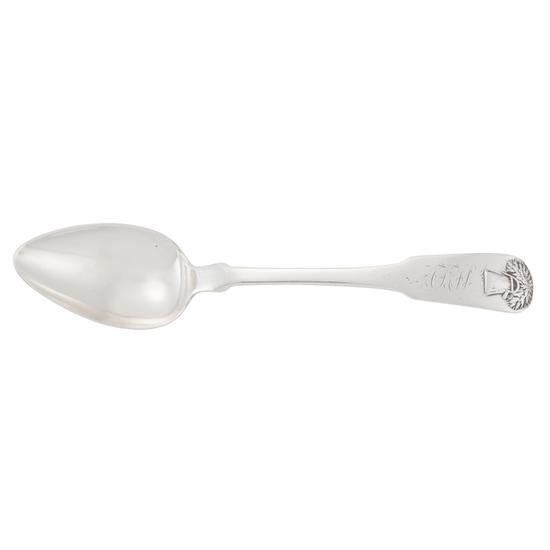 Downturned fiddle handle, rounded shoulders, pointed oval bowl with outlined shell on back, with sheaf of wheat decoration. Inscription: Engraved on handle obverse, in script: ARW. Mark: Marked on handle reverse: F. MARQUAND / [lion] / [man's profile] / [unidentified symbol]. i
