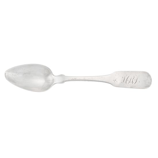 Teaspoon with downturned, back tipt, fiddle handle, rounded shoulders, and incised back drop on egg-shaped bowl. Inscription: Engraved on handle obverse in script: MRT. Mark: On handle reverse in serrated rectangle: WHITNEY & HOYT.