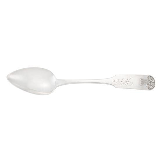Teaspoon with downturned finless fiddle handle with die-struck sheaf-of-wheat decoration and pointed oval bowl with outline shell struck on bowl back. Inscription: Engraved on handle obverse, in script: AM. Mark: Struck on handle reverse: PB&C.