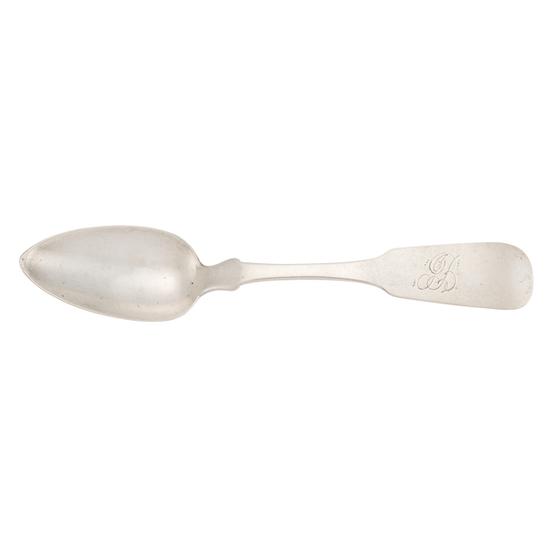 Rounded teaspoon with downturned fiddle handle, rounded shoulders, and egg-shaped bowl. Inscription: Engraved on hanlde obverse in script: JB. Mark: On handle reverse: PLATT & BROTHER.