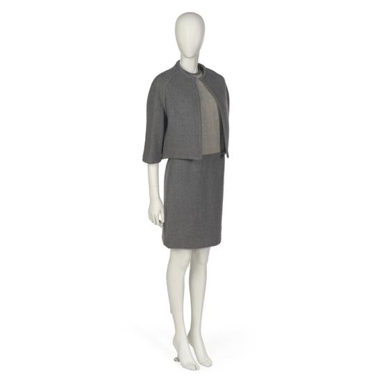 Ensemble in grey wool twill, comrpising dress, jacket, and belt