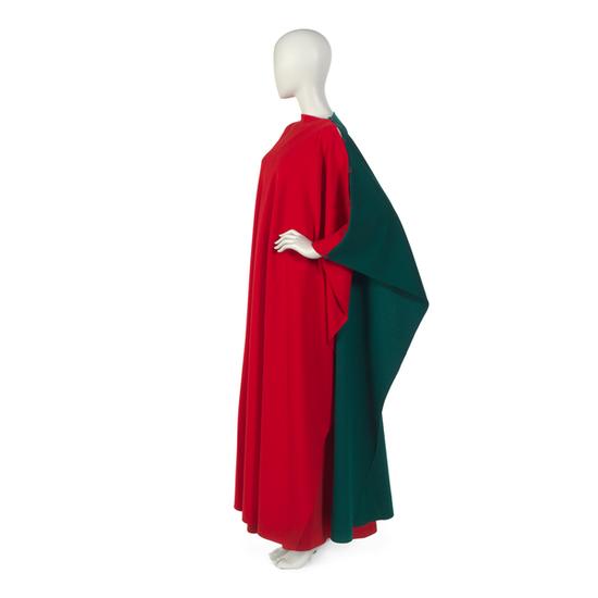 Evening ensemble in geometric printed cotton velveteen, comprising cloak and dress