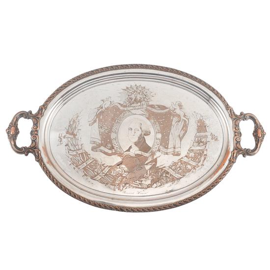 Oval silverplate on copper tray with applied border and handles. Engraved with head of George Washington within reserve surrounded by drapery and patriotic emblems. Inscription: Engraved in script on obverse: Brevoort House.