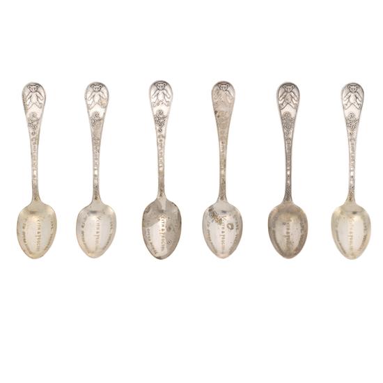 Six silver plated souvenir spoons with accompanying brown flannel pouch edged in green satin. Spoons with egg-shaped bowl, teddy bear on handle end, and raised relief inscriptions. Inscription: Engraved on handles: Compliments of. Engraved on bowl: 5th AVE. Theatre. / Keith and Proctor / Harlem Opera House.