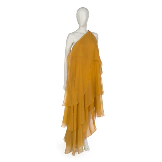 Evening dress in golden-ochre silk chiffon with gilt metallic all over paisley broche