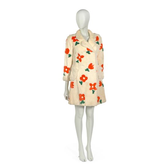 Dinner dress in white twill worsted with applied green, black and white plastic flowers at hem