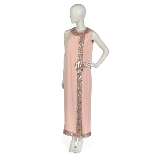 Evening dress in coral silk with applied beads, gold sequins, and stones