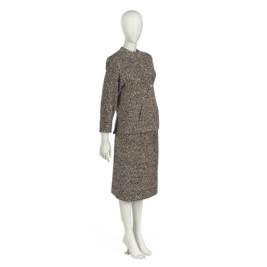 Day ensemble in peppered charcoal gray worsted wool broadcloth comprising jacket and skirt