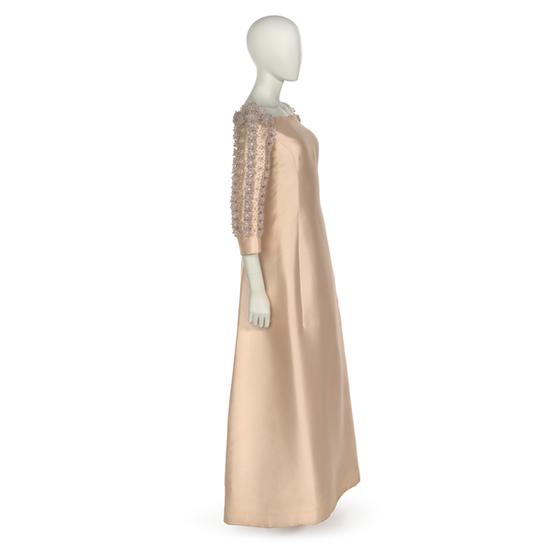 Dinner dress in off-white silk twill with floral embroidery of silk thread, sequins, beads and piping