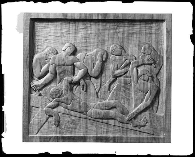 Photo [of a] carved wood panel. Station of the Cross.