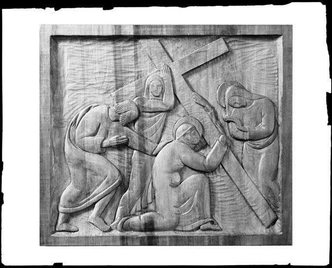 Photo [of a] carved wood panel. Station of the Cross.