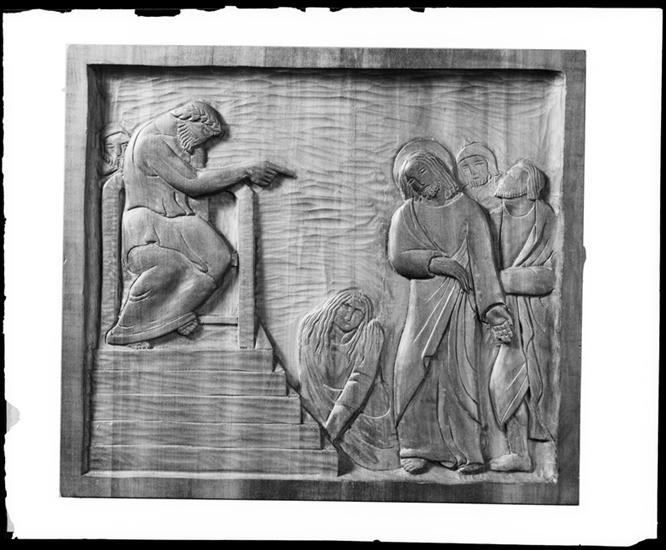 Photo [of a] carved wood panel. Station of the Cross.