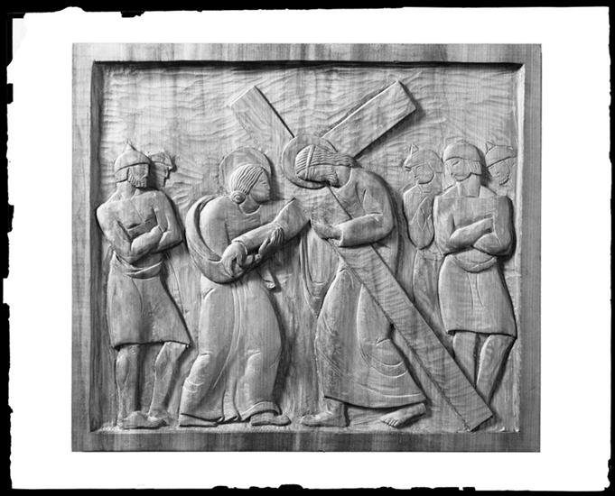 Photo [of a] carved wood panel. Station of the Cross.