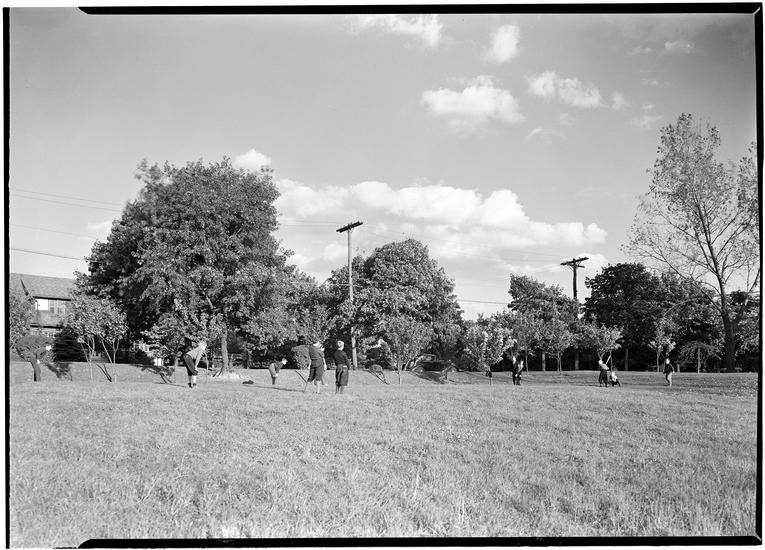 Forest Close, Forest Hills. Long Island for Cord Meyer Corp, general view of Martel St. group. Garage in foreground.
