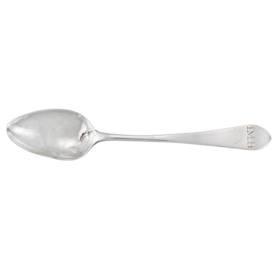 Spoon with pointed egg-shape bowl and downturned, back tipt, single drop handle. The bowl cracked. Inscription: Engraved on handle obverse: IMH Mark: On handle reverse in rectangle: I & PT [lion mask] and [ship with billowing sail or letter P] in conforming enclosures