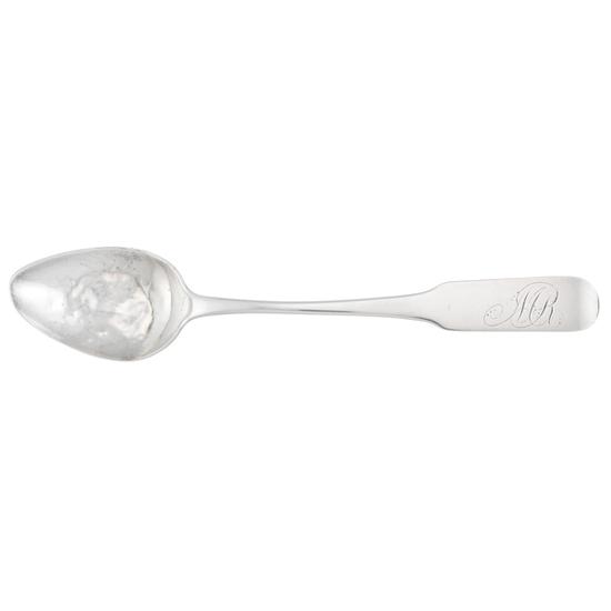 Spoon with downturned fiddle handle, short-back tipt, and bowl-back drop. The bowl is in poor condition. Inscription: In script on handle obverse: M R Mark: On handle obverse in serrated rectangle: S. BROWN