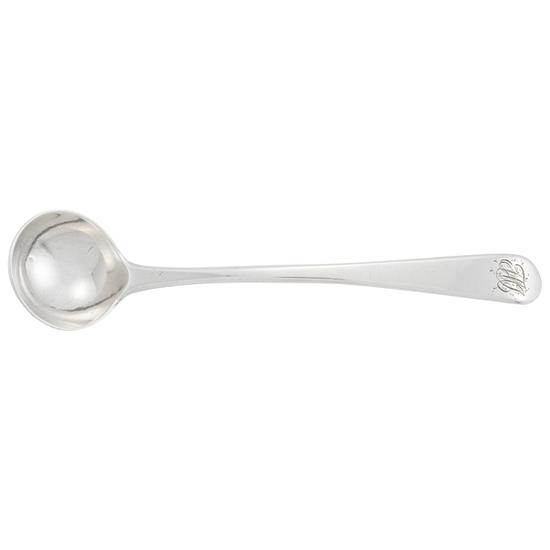 Salt ladle with downturned rounded spatulate handle, short back midrib and round bowl with molded back drop. Inscription: Engraved on handle obverse: TMJ. | Mark: Marked twice on handle reverse: GS.