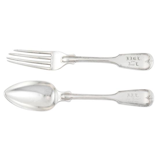 Teaspoon with egg-shape bowl and straight fiddle handle decorated with thread pattern. Inscription: Engraved on handle obverse: "J.J.L" in Old English caps / "from Tuthie" in script / "June 8th 1844." in script. Mark: Struck on handle reverse: "GELSTON & TREADWELL" in rectangle.