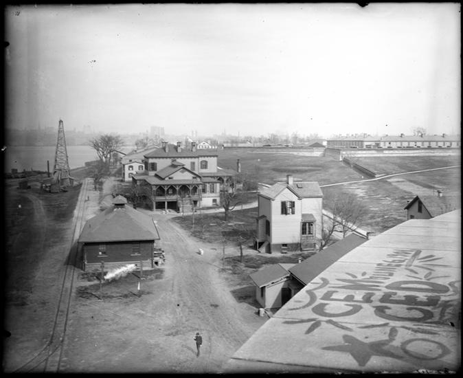J.G. Monument. Rendered perspective of monument from river up to a statue with two temples.