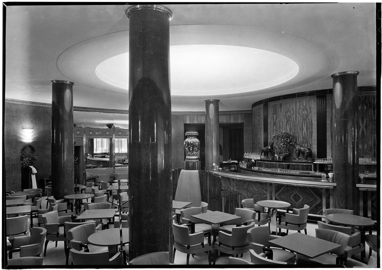 Waldorf-Astoria Hotel. Men's Bar. Large veneer panelling above table.