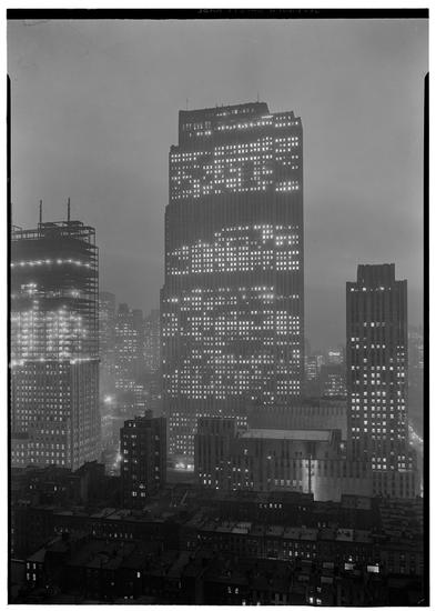 New York City views. RCA Building flooded [with light] from 49th Street.