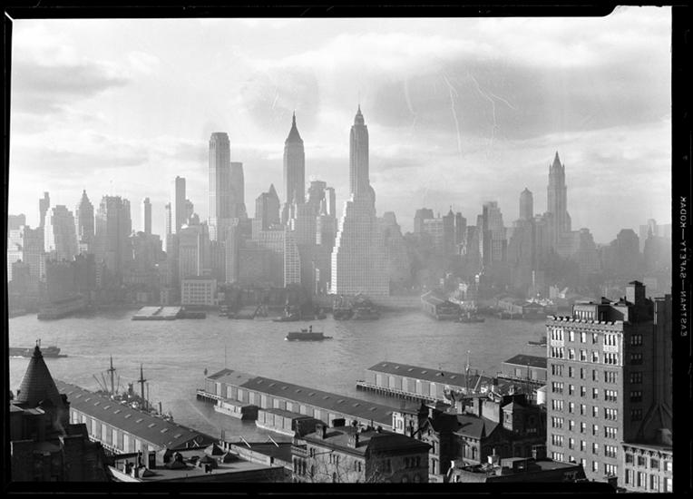 New York City views. Financial District from foot of Fulton Street East River, tug in foreground.