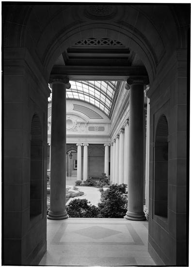 Frick Gallery, 1 East 70th Street. Garden court through pillars.