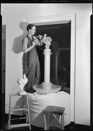 Steuben Glass Inc., 748 Fifth Avenue. Sculptor Waugh at fountain, 1.