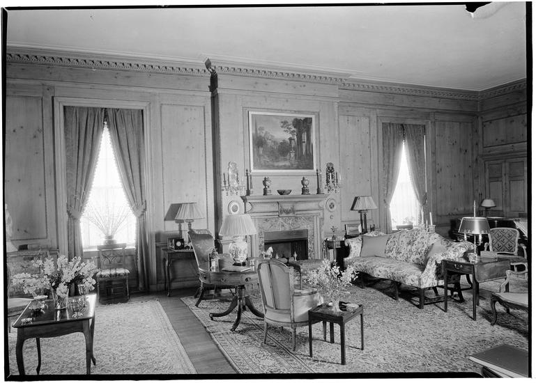 Vincent Astor [residence]. General view decorated living room thru door, candles lighted.