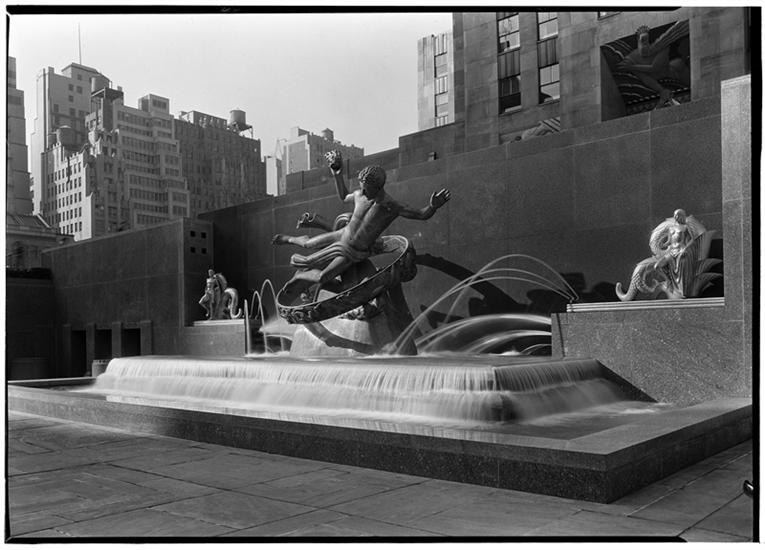 Rockefeller Center. City Garden Club and frountain from below, close.