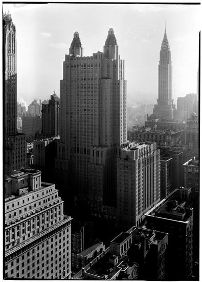 Changing New York [Aerial view looking east showing the General Electirc Building, the Waldorf-Astoria and the Chrysler Building.]