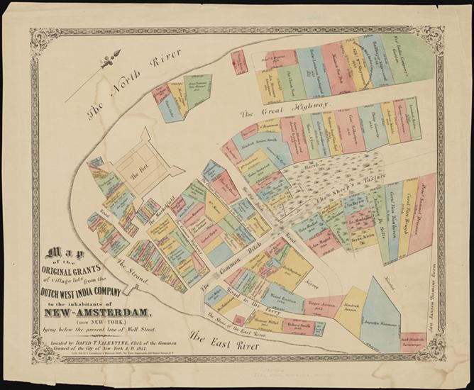 Map of the original grants of village lots from the Dutch West India Company to the inhabitants of New-Amsterdam (now New-York) lying below the present line of Wall Street.