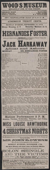 Monday, May 5, 1873, the celebrated pantomimist and actor Mr. Hernandez Foster in his characterization of Monday, in the nautical drama from Frank Leslie's Weekly, "Jack Harkaway: Afloat and Ashore"