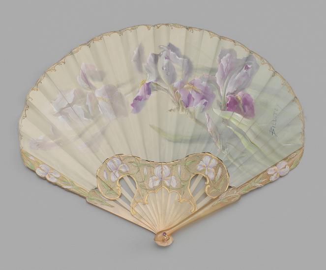 Folding fan of painted silk and net cutwork leaf