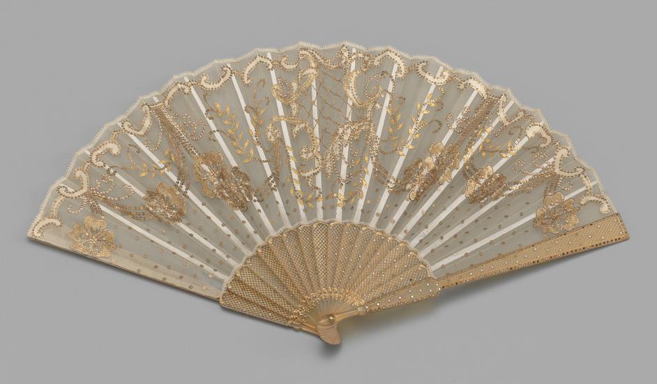 Folding fan of eau de nil silk net leaf with applied gold sequins