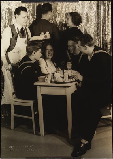 Private First Class Bob Moore, Irving Shergel, Busboy Tom Rutherford, Soldier Leroy Feurtods, Senior Hostess Dorothy Peterson (Stage Door Canteen).