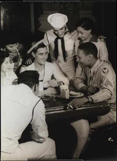 Embossed on recto: PHOTOGRAPH BY / CARL VAN VECHTEN; in ink, on verso: Stage Door Canteen / In foreground, Seaman Michael Bonifazio / Junior Hostess Captain Elaine Kent / Junior hostess Helene Tsang /