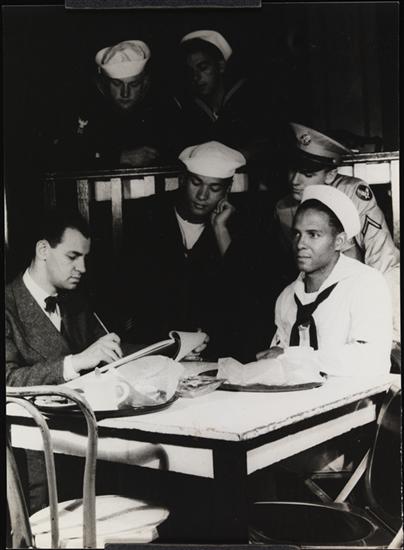 Embossed on recto: PHOTOGRAPH BY / CARL VAN VECHTEN; in ink, on verso: Stage Door Canteen / Carl Kent drawing. / at table: merchant seaman Marcus Jackson, P.F.C. William / R. Sevanton, jr. Gunner's ma