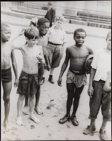 This boy is writing on the other boy's back with white chalk: "F... the cops."