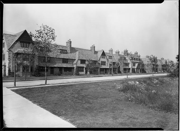 Forest Close, Forest Hills. Long Island for Cord Meyer Corp, general view of Martel St. group. Garage in foreground.