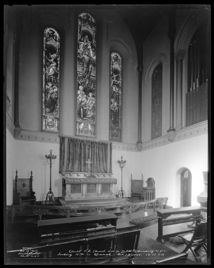 71st Street at the N.W. corner of Broadway. Photo record, Christ Protestant Episcopal Church, Sunday School room. Looking west at arch to chancel.