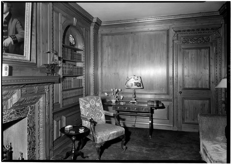 W. L. Richard [residence]. Corner of library with lighted lamp, reversed lighting.