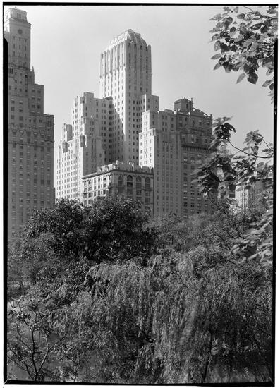 Barbizon Plaza Hotel. Exterior from Central Park between trees.