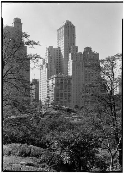 Barbizon Plaza Hotel. Exterior from Central Park over rock.