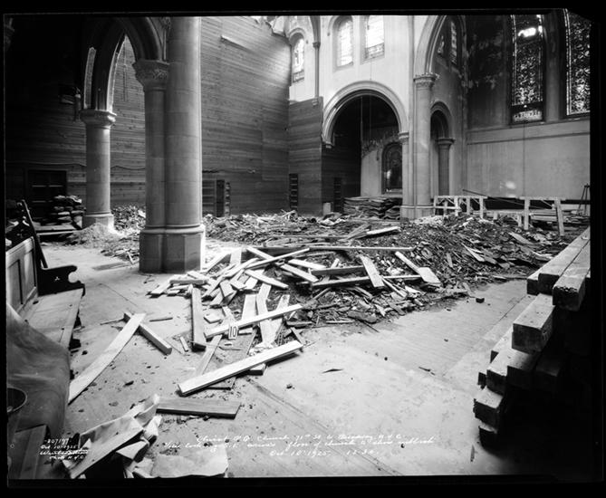 71st Street at the N.W. corner of Broadway. Photo record, Christ Protestant Episcopal Church, Sunday School room. Looking S.W. at a temporary partition at east end of church after high winds blew same