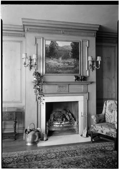 Francis M. Weld [residence]. Living room fireplace through arch.