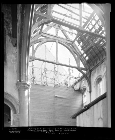 71st Street at the N.W. corner of Broadway. Photo record, Christ Protestant Episcopal Church, Sunday School room. Looking up at roof to south transept.