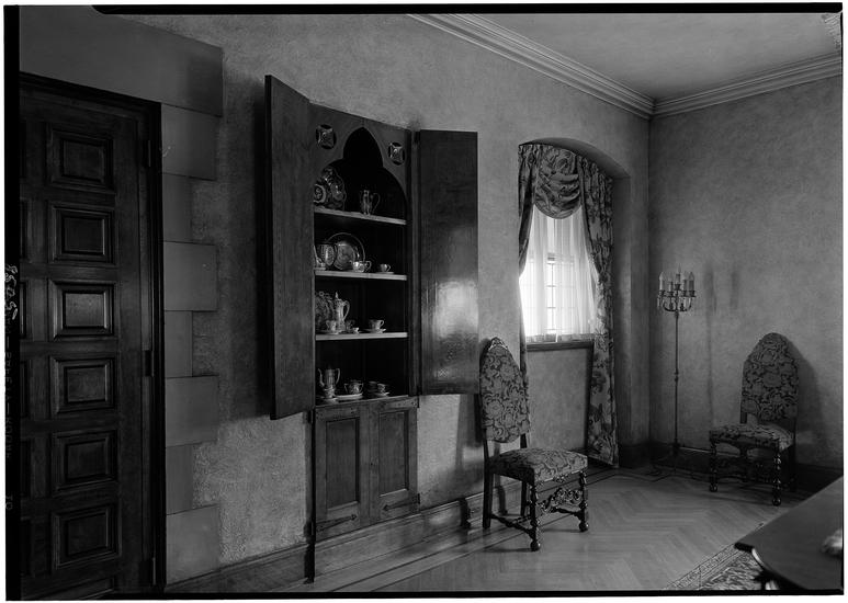 George F. Wagner [residence]. Sharp view fireplace and cupboard dining room.