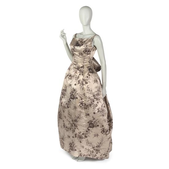 Evening dress in white satin and floral chiné ribbons