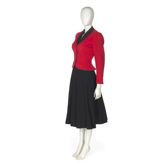 Suit comprising jacket in cream wool crepe twill and skirt in bright red wool crepe